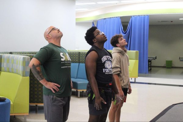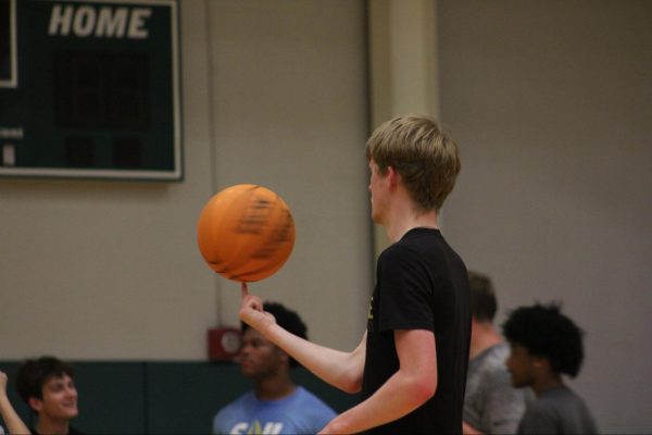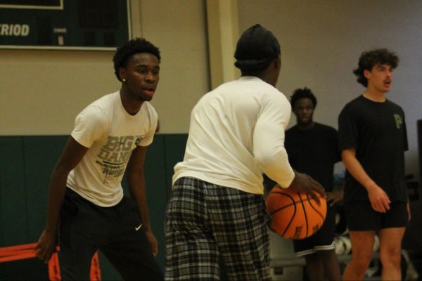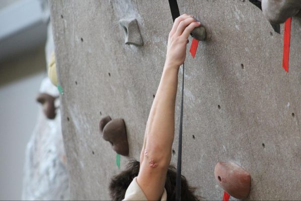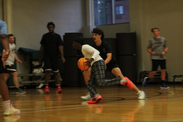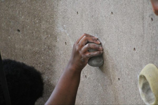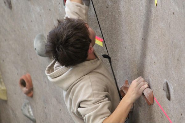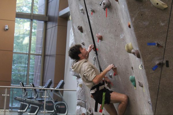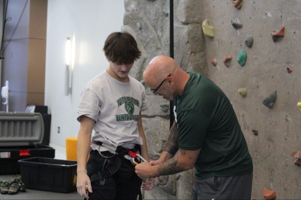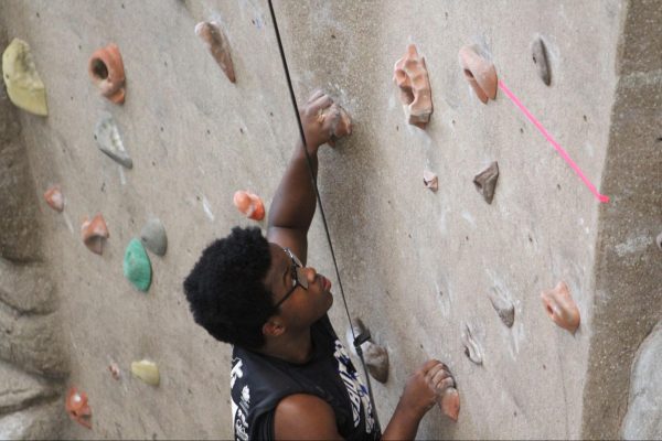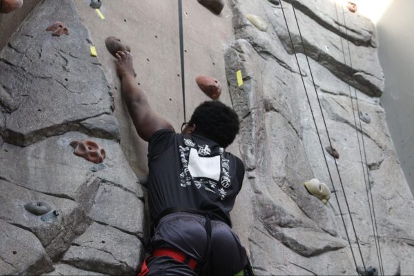 Outside of the auto-belay and marked routes, students can climb the lower half of the wall without needing to be belayed, known as boulder climbing.Livingston Jenkins climbing the unmarked route below the tape, commonly known a the section climbers boulder on.Rec Games Night isn’t the only time students can shoot hoops. Students can use the commons gym at any time during the day and access the Lion’s Den to grab a basketball.Sophomore Micah Reese participating in a game of pickup basketball in the commons gym during Rec Games Night.Students can utilize the rock wall at any skill level. The wall includes two auto-belay systems, which can be used for the easier routes.Jason Croy helping Nicholas Parker safely secure his harness to begin climbing. Jason Croy offers positivity and heavily encourages students to succeed, whether that’s in academics, life, or physical activities.Roar newspaper head designer August Gotter participating in his third Tuesday, attending the Rec games night.The rock wall is open during the week, anytime before 5 p.m., for solo climbing.Jason Croy (left), Livingston Jenkins, Jackson Parker (right), watch as fellow students challenge themselves by climbing the red route on the rock wall.Jonathan Isaac, sophomore, guarding online professor Anthony Newton, who is attempting to drive to the paint.Rec Games Night takes place every Tuesday from 6 p.m. to 9 p.m. in the Commons, allowing students to be involved in various activities – climbing the rock wall, playing pickleball, participating in pick-up basketball and other recreational sports.Freshman Drew O’Neil guarding one of Piedmont University’s online professors Anthony Newton in a pickup game at the Rec Games Night event.Jackson Parker nearing the top of the rock wall, which students from the second floor of the commons can see climbers make it to the top.