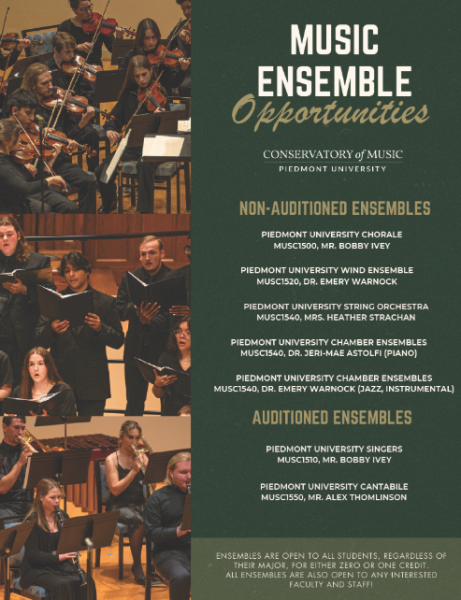Any questions on what the conservatory offers, or how to join, can be forwarded to [email protected], or any of the faculty members listed on the flyer provided by the Piedmont Conservatory.